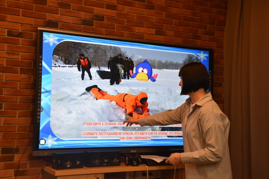 Ребятам рассказали, как определить прочность льда, как действовать, если ты сам провалился под воду, и как правильно помочь другому человеку, используя подручные средства.