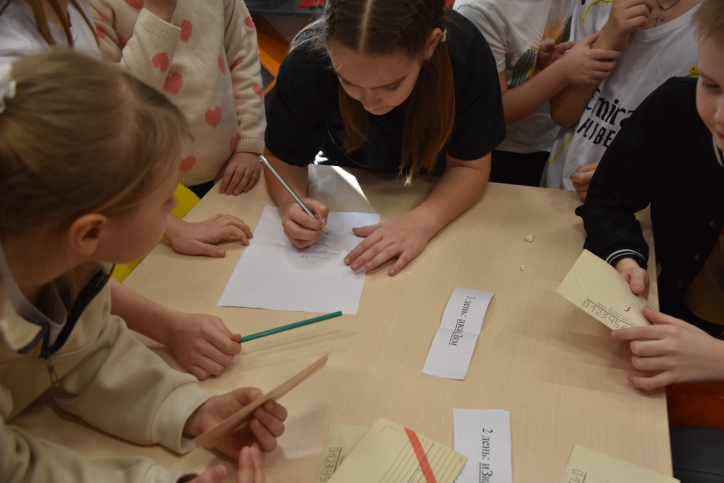 На пороге юных гостей встретила сама Обворожительная Зима. Она проводила ребят в первый зал, где им предстояла непростая задача: найти по всему помещению конверты. Внутри оказались названия дней Масленичной недели, но с подвохом — буквы в словах перепутались. Юные эрудиты блестяще справились с головоломкой и заработали свой первый трофей — соль для будущего теста.
